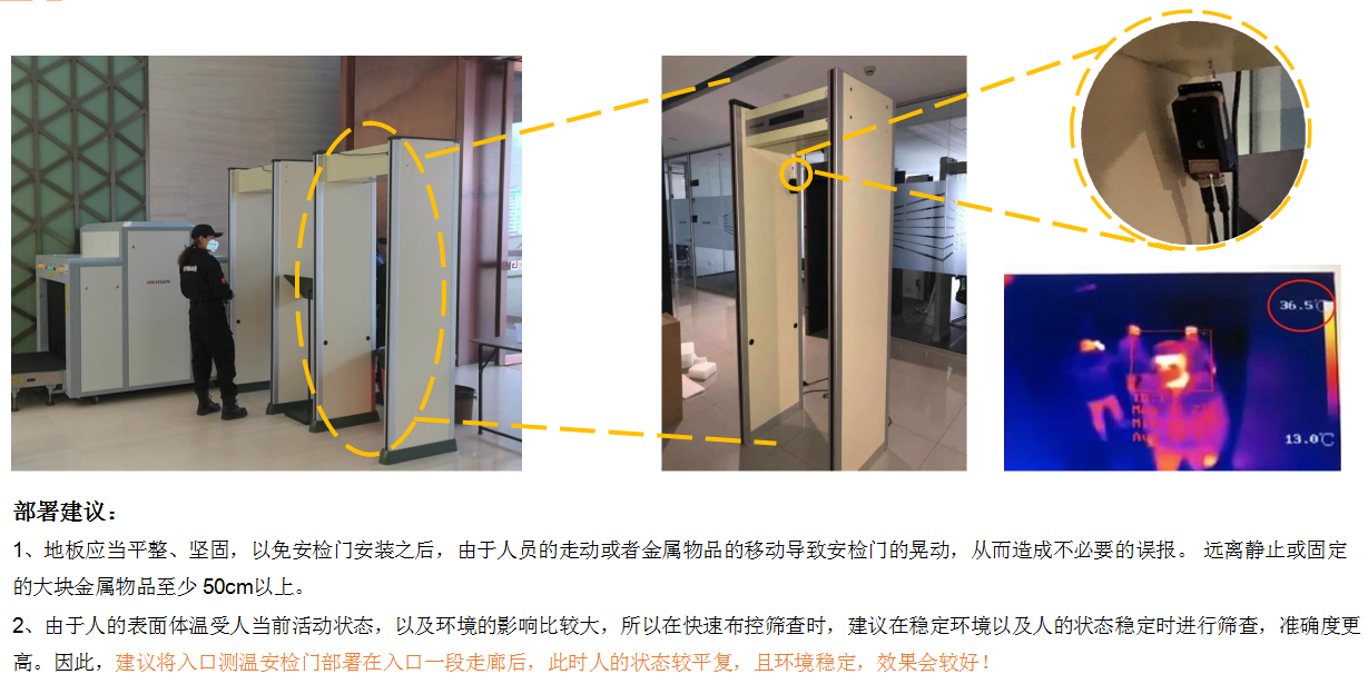 快速测温安检门:无感测温:可对通过人员进行脸部测温并匹配;温度显示报警:温度显示在LCD屏幕上,超过阈值,可联动报警;热力图显示:现场可通过4200或web实时查看热力图;人脸抓拍:左右各一路200W摄像头,进行人脸抓拍;金属检测:可检测到1个回形针大小的金属;联网功能:可实现联网互通,搭配平台对数据汇聚分析;